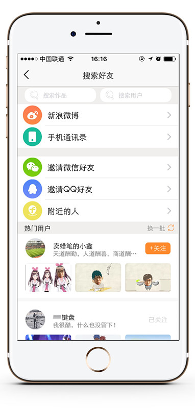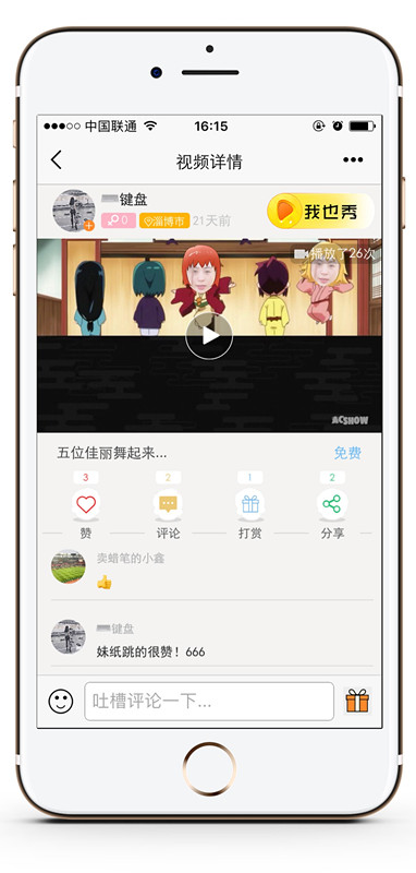 提供用戶點贊功能,并具有即時通訊,實現(xiàn)一對一單聊,亦可多人對同一用戶作品進(jìn)行評價、打賞。同時支持分享用戶作品到QQ,新浪,微信,也可下載保存到本地。